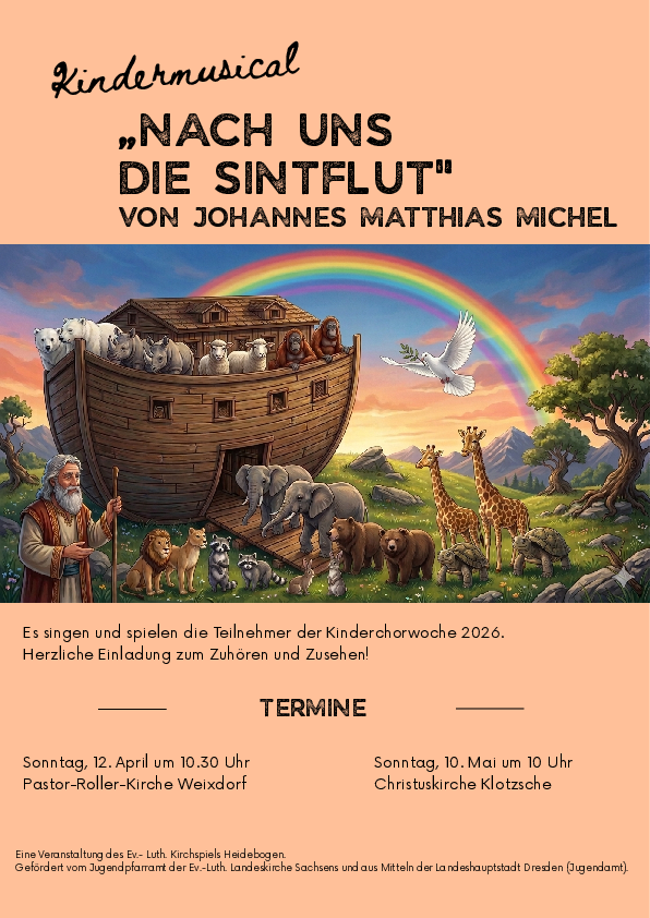Wir laden ein zu den Aufführungen des Kindermusicals „Nach uns die Sintflut“ von Johannes Matthias Michel am Sonntag, 12. April um 10.30 Uhr im Gottesdienst in der Pastor-Roller-Kirche in Weixdorf und am Sonntag, 10. Mai um 10 Uhr im Gottesdienst in der Christuskirche.